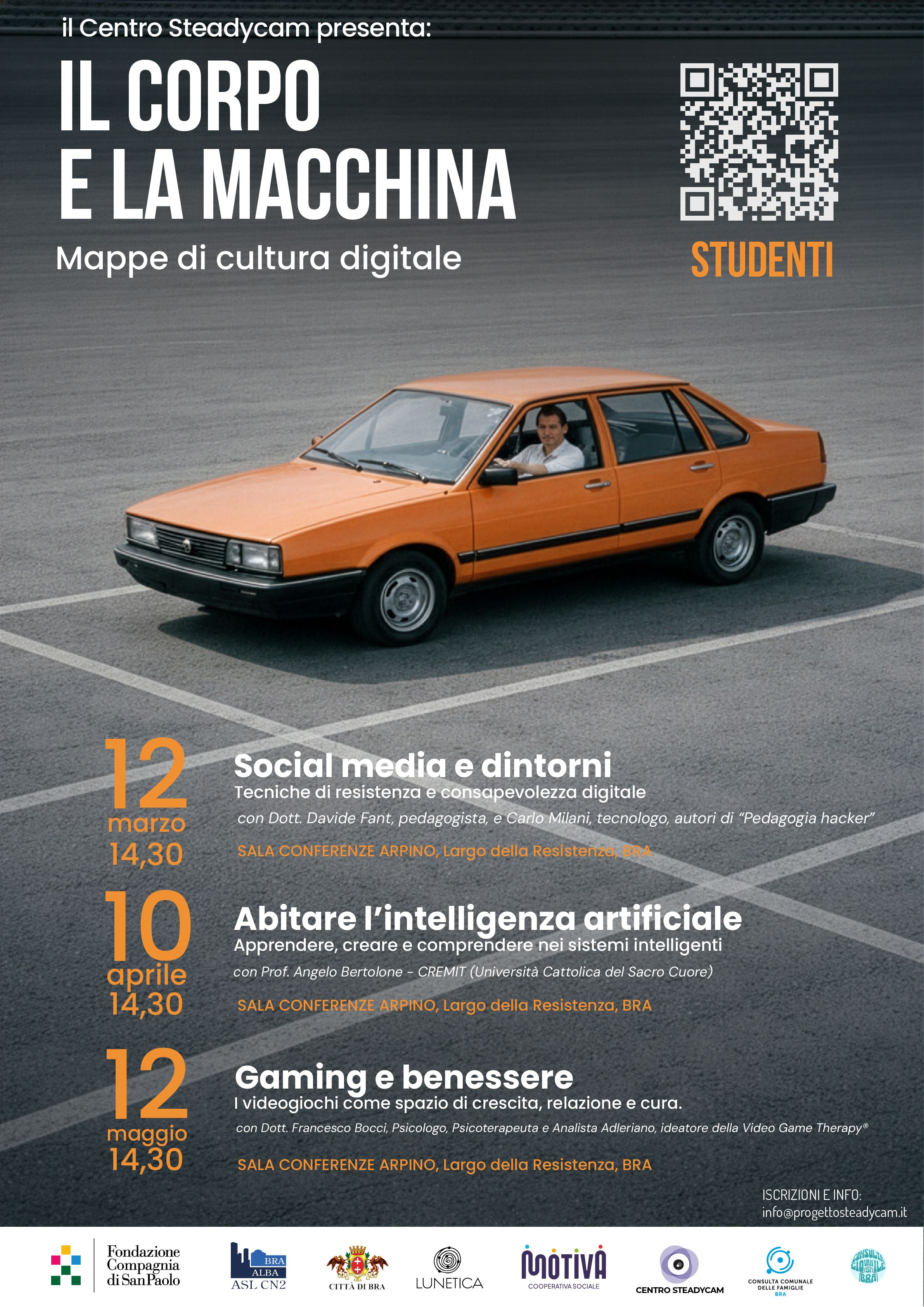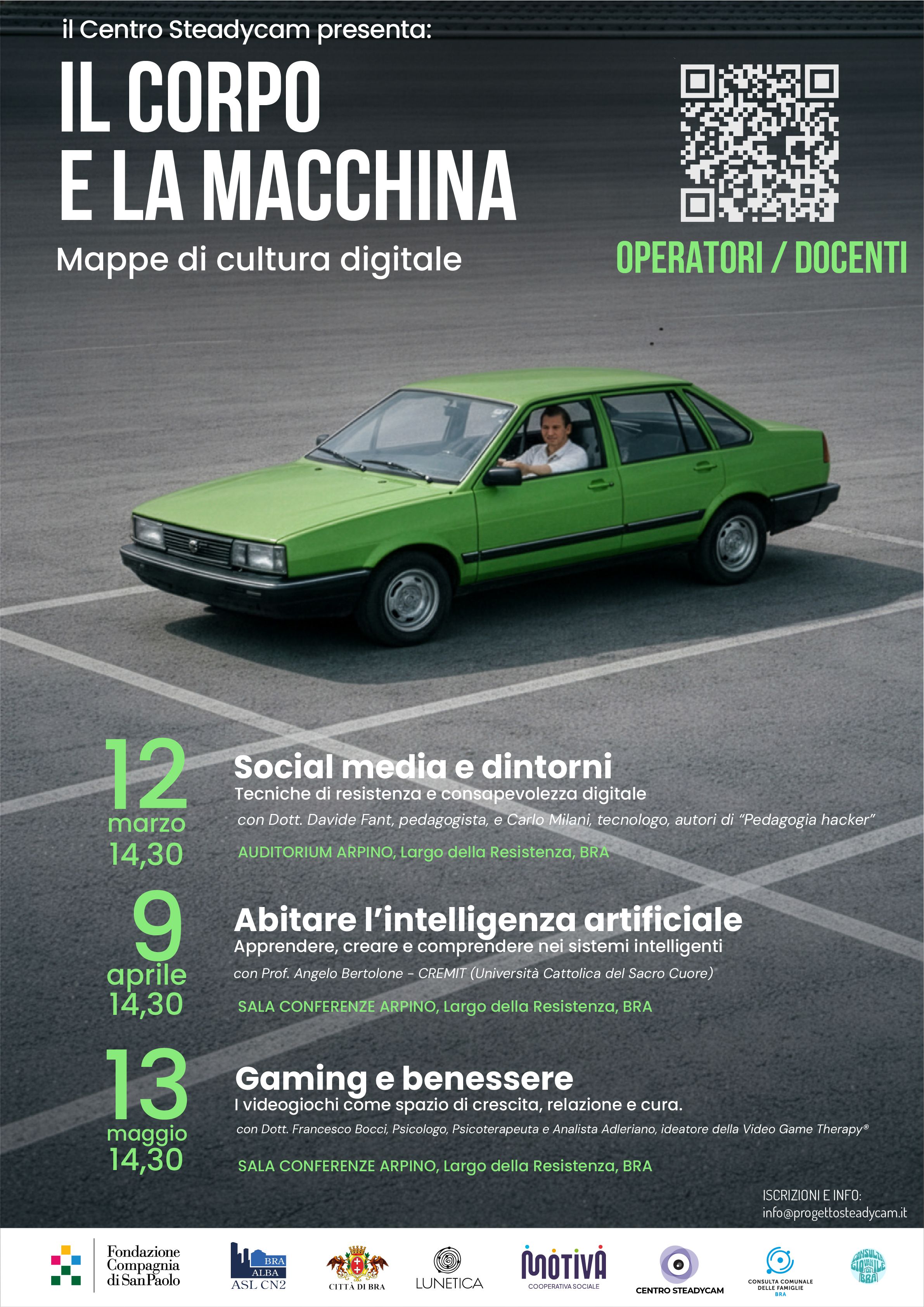 Coerentemente con questa sua missione e in continuità con i progetti finora implementati, il Centro Steadycam dell’ASL CN2 propone ora “Il Corpo e la Macchina”, un ciclo di tre eventi dedicati alla promozione della cultura e del benessere nell’approccio al digitale, inteso come spazio di crescita e sviluppo di competenze, ponendo attenzione al suo equilibrio con le dimensioni corporea, mentale e relazionale.