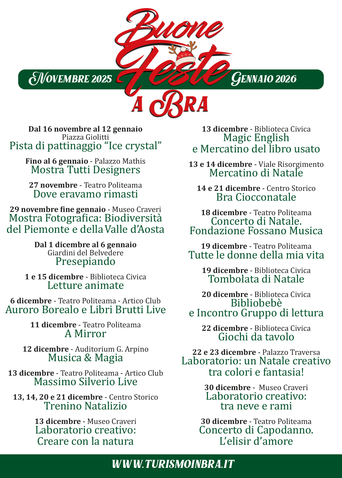 L’incanto del Natale arriva a Bra, e lo fa con tante iniziative dedicate a grandi e piccini. Mentre le luminarie già illuminano le vie e le piazze di Bra - grazie al contributo del Comune, di Ascom Bra, Comitati di via e sponsor - una serie di eventi tematici accompagnerà la città e i suoi visitatori fino a fine dicembre. Di seguito l’elenco degli appuntamenti, realizzati in collaborazione con diverse realtà cittadine. Per il dettaglio degli eventi e il programma aggiornato, consultare il sito www.turismoinbra.it o chiamare l’ufficio Manifestazioni al numero 0172.430185.